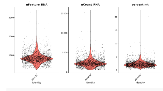 또한, 기본적으로 세포마다의 총 유전자 개수(nFeature_RNA), 총 RNA 수(nCount_RNA), 미토콘드리아 유전자 비율(percent.mt) 각각을 바이올린 플롯으로 나타냄으로써 세포들의 분포를 확인해 필터링 기준을 정할 수도 있습니다. 다음과 같이 말이죠.