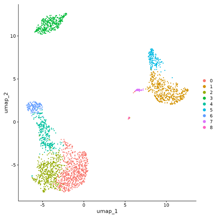 클러스터링을 진행하면 각 세포에는 군집 ID가 부여됩니다(seurat_cluster에서 확인 가능). 이를 UMAP 등 임베딩 플롯에 색깔로 표시하면 분류된 군집들을 시각화할 수 있습니다. 아래 이미지는 Seurat 홈페이지에 있는 이미지로, PBMC 데이터의 UMAP 시각화 결과, 9개의 클러스터를 색상으로 표현한 것입니다.