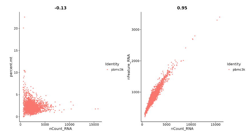 plot1 <- FeatureScatter(pbmc, feature1 = "nCount_RNA", feature2 = "percent.mt")