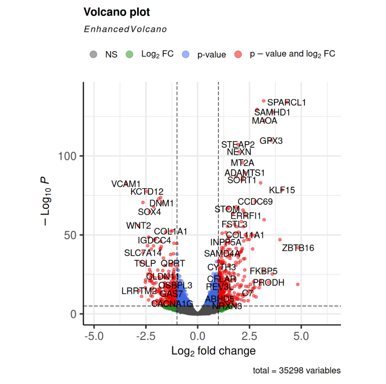 사실 저는 해당 유전자들이 유의하게 관여하는 경로가 등장해도 이게 어떤 의미를 갖는지 종합적으로 판단하긴 아직 어려운 듯 합니다. 물론 여타 논문들을 보면 조건별 혹은 클러스터별로 유의하게 상향 조절되는 유전자를 대상으로 해당 유전자가 관여하는 경로나 기능을 파악하는 다운스트림 분석을 많이 하는 것 같습니다. 암튼 이렇게 유의하게 상향 조절 되는 유전자 혹은 하향 조절되는 유전자는 다음과 같이 VolcanoPlot으로 나타낼 수 있습니다.