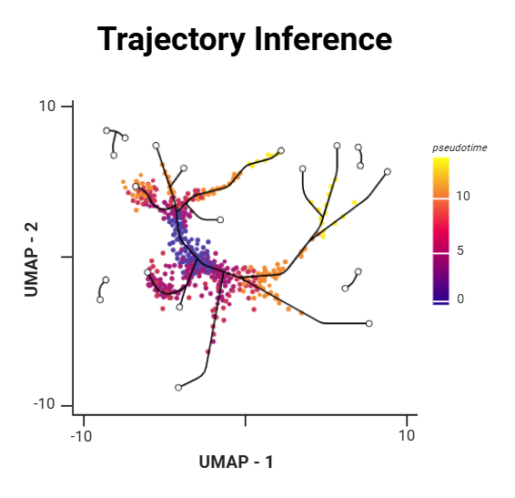 Trajectory Inference는 세포가 분화, 발달, 세포 주기 진행 등을 통해 연속적인 상태 변화를 보이는 경우, 각 세포를 시계열상의 한 지점으로 배치하기 위해 pseudotime 개념을 도입하는 다운스트림 분석 방법입니다. 여기서 pseudotime이란 실제 시간이 아닌 세포가 잠재적 생물학적 변화를 따라 이동하는 과정을 ‘유사 시간축’으로 나타낸 값으로, 특정 생물학적 과정에서 세포가 어느 지점에 위치하는지를 상대적으로 추정하기 위해 계산된 지표입니다. 즉, 세포들의 발현 양상을 통해 발달 혹은 분화의 진행 정도를 가늠할 수 있게 해 주는 값이며, Trajectory Inference를 통해 이를 예측하고 시각화할 수 있습니다.