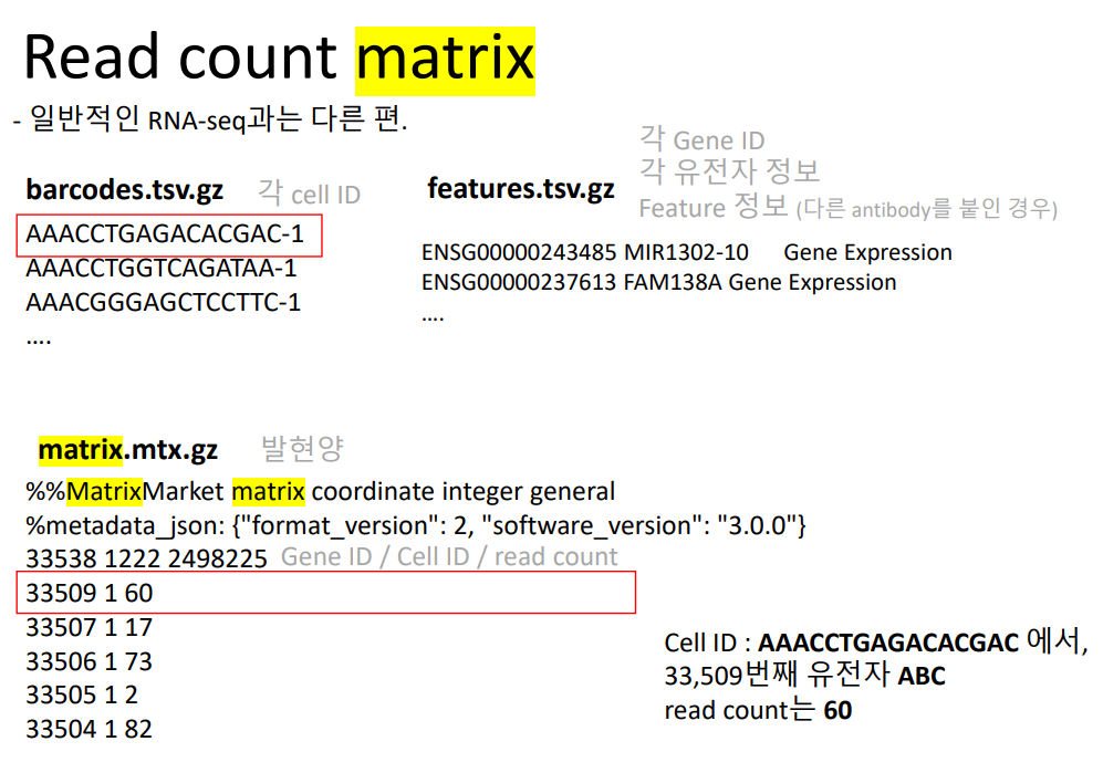 그렇게 저희는 10X Genomics 시퀀싱 데이터 결과물로 세 가지 파일을 제공받을 수 있는데요, 각각 'barcodes.tsv', 'features.tsv', 'matrix.mtx' 파일입니다. 먼저, 바코드 파일은 앞서 비드에 붙어있던 Cell barcode 서열이 담긴 파일입니다. 이 바코드는 각 유전자가 어떤 세포에서 유래되었는지 알려주죠. 다음으로 feature 파일의 경우엔 각 유전자의 ID와 그에 맞는 유전자 이름을 제시해주는 파일인데요. 아래 이미지를 참고하시면 되겠습니다. 마지막 매트릭스 파일은 세포별 유전자들의 발현량 정보를 담은 파일입니다.