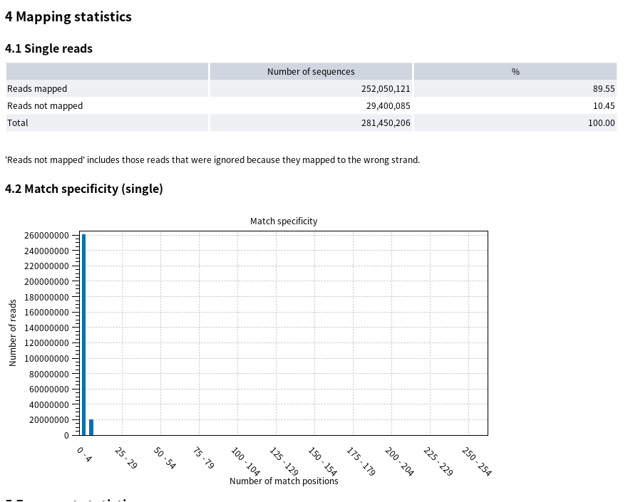 여러 정보들이 나오지만, 그중에서 '4. Mapping statistics'를 확인해보면 전체 리드 중 몇 퍼센트가 매핑이 되었는지를 알 수 있습니다. 약 90%의 리드가 매핑이 된 걸 보니 매핑이 잘되었음을 알 수 있습니다. 만약 매핑이 50% 이하로 되었다면 오류가 났을 확률이 있습니다.