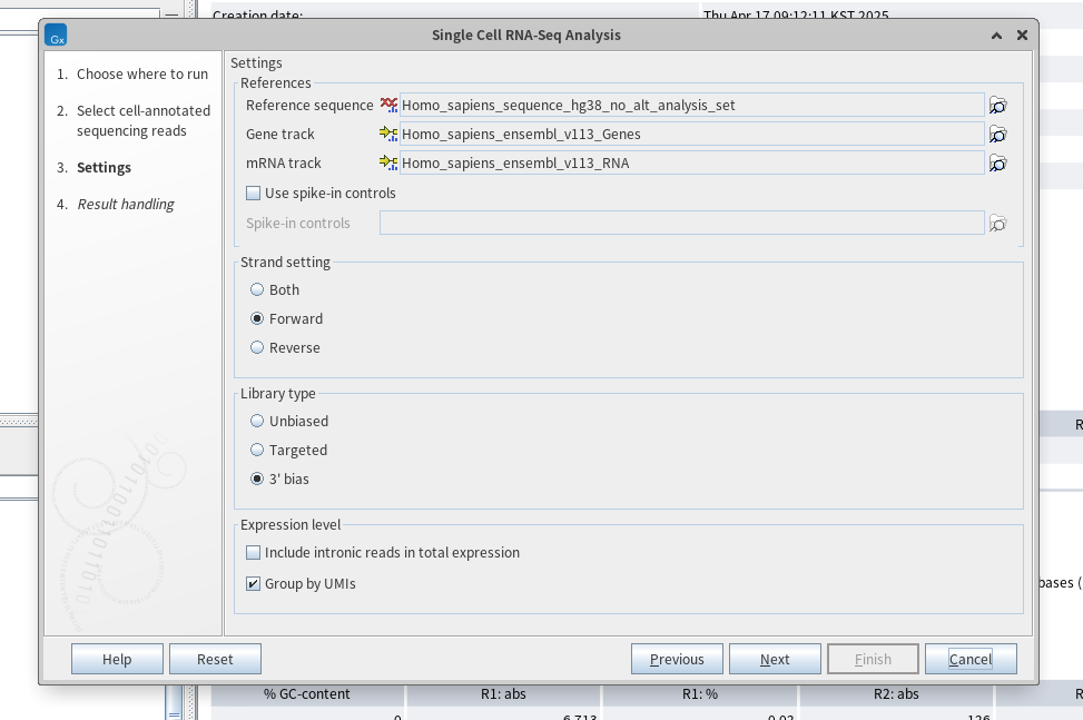 그리고나서 Next 버튼을 누르다 보면 어떤 라이브러리를 사용했는지 선택하는 그런 화면이 등장합니다. 데이터 형태에 적합한 라이브러리를 선택하면 됩니다(ex. read1 : 바코드 및 UMI 서열, read2 : cDNA 서열). 그럼 좌측 맨 하단에 다음과 같은 글자가 뜨면서 annotate 절차가 진행됩니다.