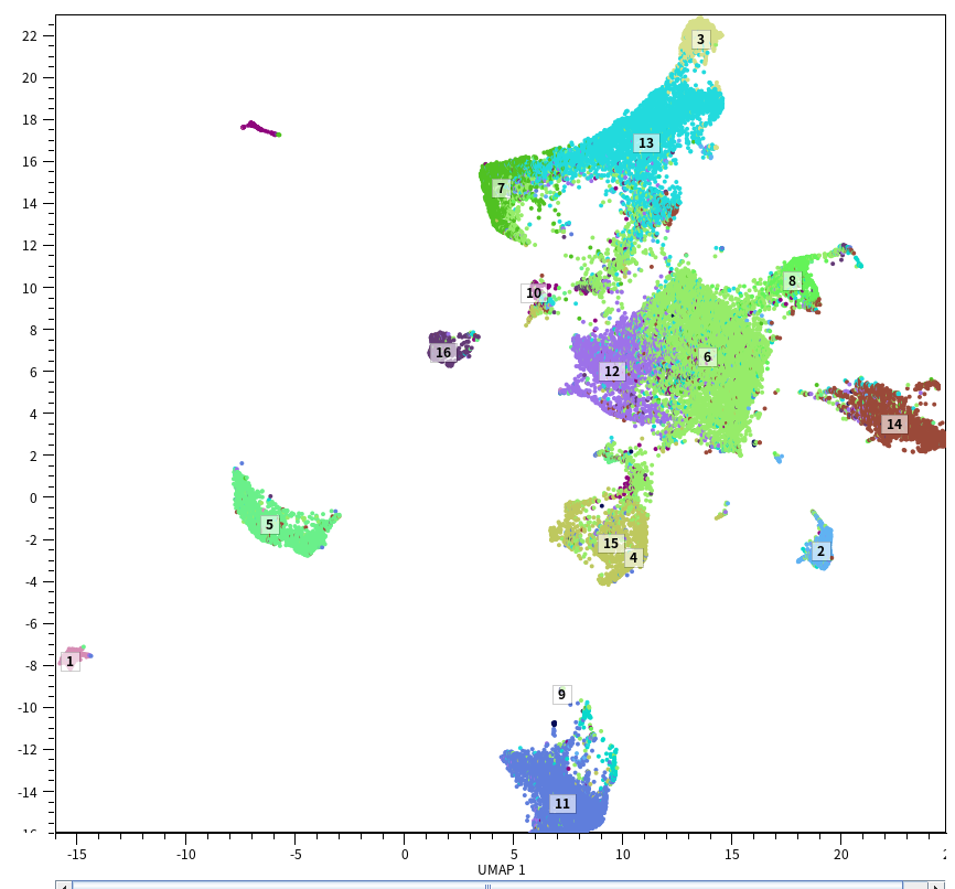 그랬더니 해상도 0.1을 기준으로 아래와 같이 16개의 클러스터가 UMAP 공간에 구분되어 표현되었습니다.