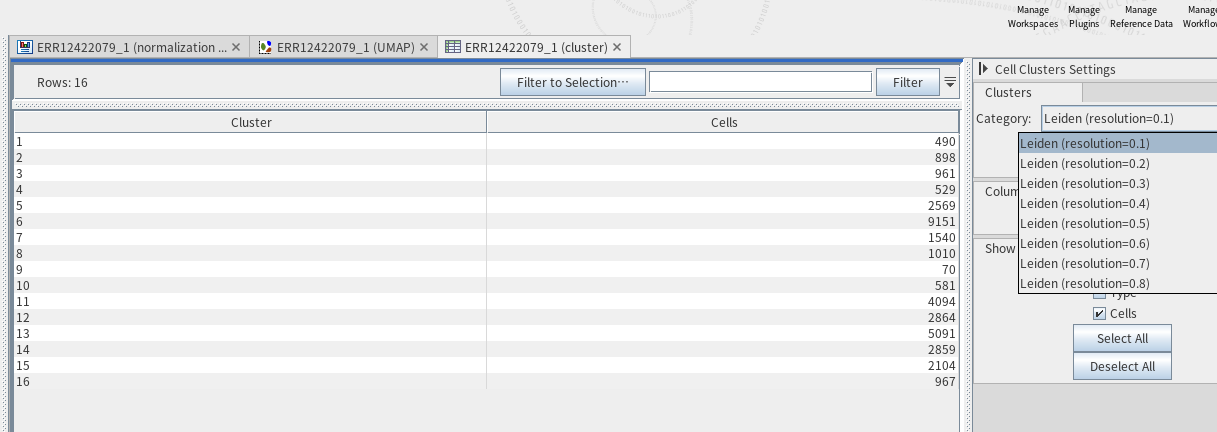 파일을 눌러서 확인해보면, 해상도별로 몇 개의 클러스터가 등장했고 해당 클러스터에는 몇 개의 세포가 할당되었는지 확인할 수 있습니다. 제가 해상도(resolution)를 고정하지 않았기에 0.1부터 1.5까지 0.1 단위로 비교해볼 수 있습니다. 확인해보니 해상도 0.1로도 클러스터가 16개나 등장하기에 해상도 0.1을 기준으로 두겠습니다(배치 보정이 잘 안된건가.. 암튼 넘어가겠습니다).