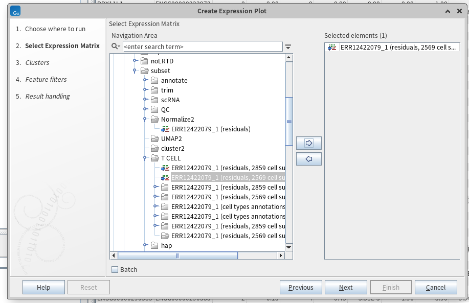 여기서 궁금해졌습니다. T 세포로 예측된 5번째 클러스터에서 LRTD 환자의 세포들(1525개)과 NO-LRTD 환자의 세포들(924개) 간 기능적 차이가 나타나는지, 그리고 T세포로 예측된 14번째 클러스터에서 LRTD 환자의 세포들(1298개)과 COVID-19 환자의 세포들(1469) 간 기능적 차이가 나타나는지 말이죠. 이를 비교하기 위해 DEG(differental expression genes) 분석을 진행해보도록 하겠습니다. tool box의 expression analysis > create expression plot을 클릭해줍니다. 그리고 서브셋으로 얻은 정규화 파일을 옮겨줍니다(5번 클러스터와 12번 클러스터 각각 두번 진행했습니다).